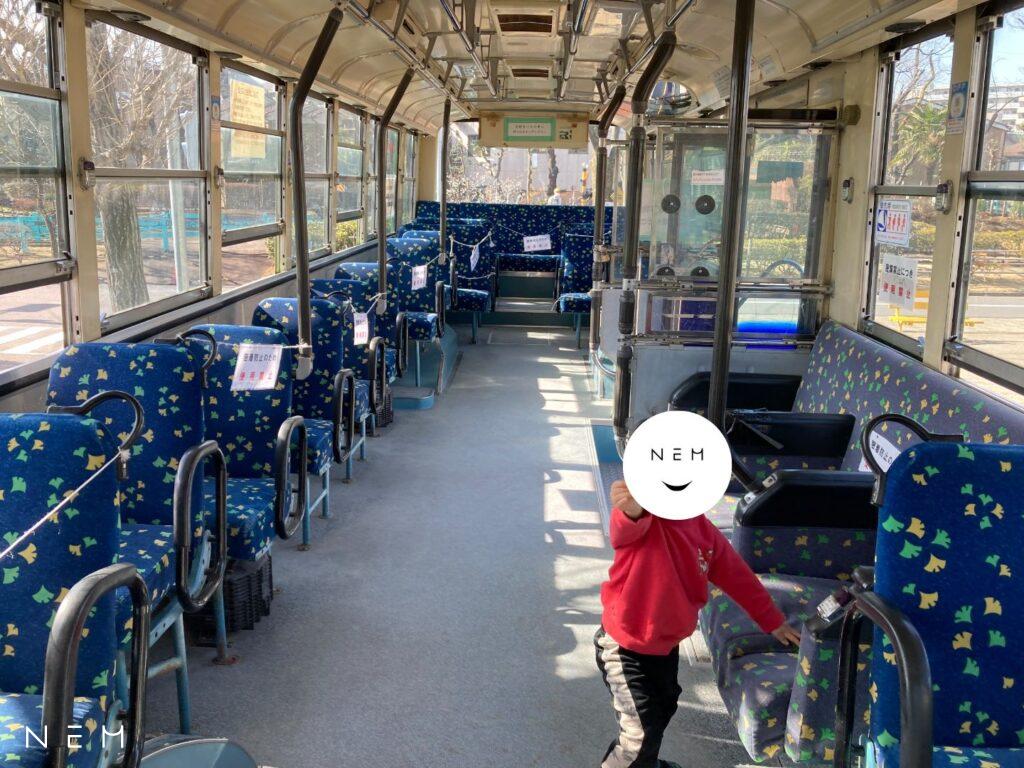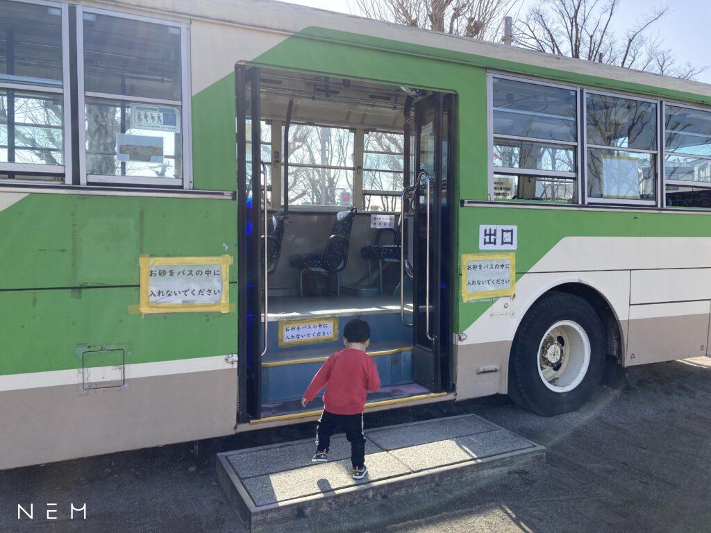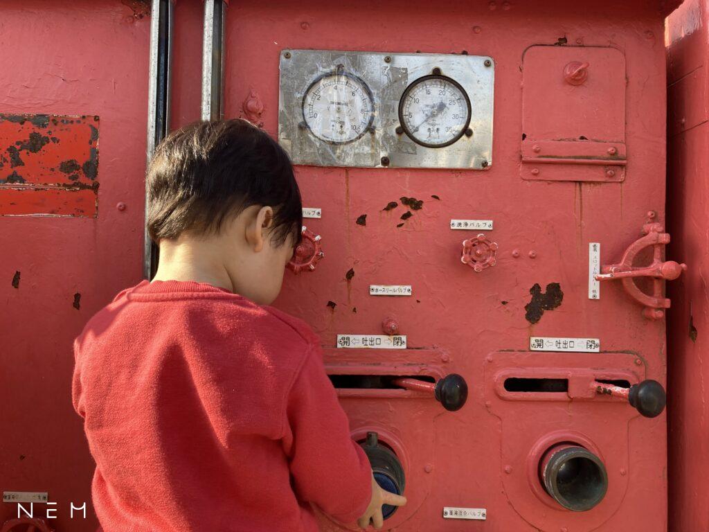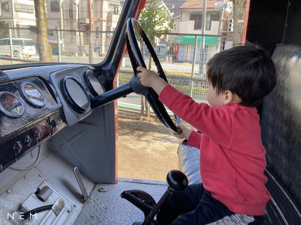 ミニSLと同じくらい子どもウケするポイントが敷地内にあるバスや消防車に乗れること。どちらも動かない状態で展示されていますが、車内で自由に遊びまわることができますし、運転席に座ることも可能です。家の車とは違う大きなハンドルに子どもも興味深々でした。