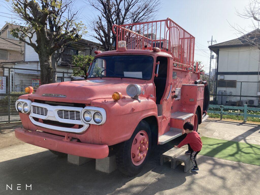 消防車は、普段街中で見かけるものとは異なるレトロな車両です。絵本の「しょうぼうじどうしゃじぷた」を読んだことがあれば、子どもでもしっくりくるかもしれませんね。