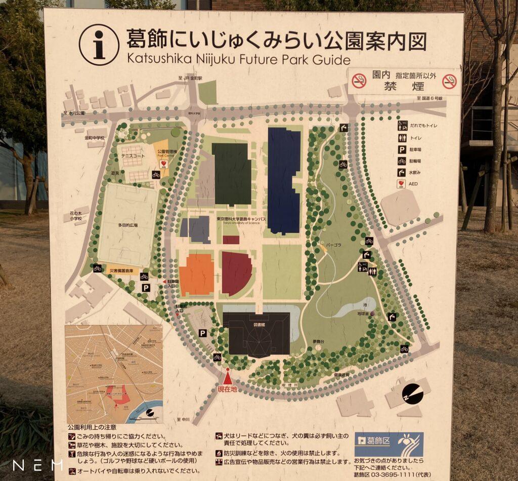 未来わくわく館は東京理科大学の敷地内に位置しますが、そのすぐ隣にはすぐ公園が広がっています。遊具はありませんが、池から水路が流れ、管理された綺麗な芝生の広がる公園で、散歩するだけでも気分転換になりますよ。