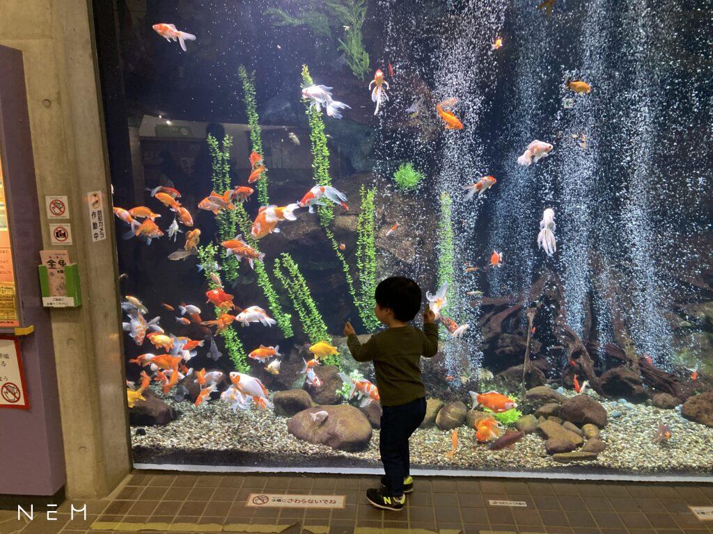 受付でチケットを手渡し入館すると、まず目に飛び込んでくるのは「出会いの広場」と呼ばれる巨大な水槽。大きな金魚が水槽の中を悠々自適に泳ぎ回っており、圧倒的な没入感です。