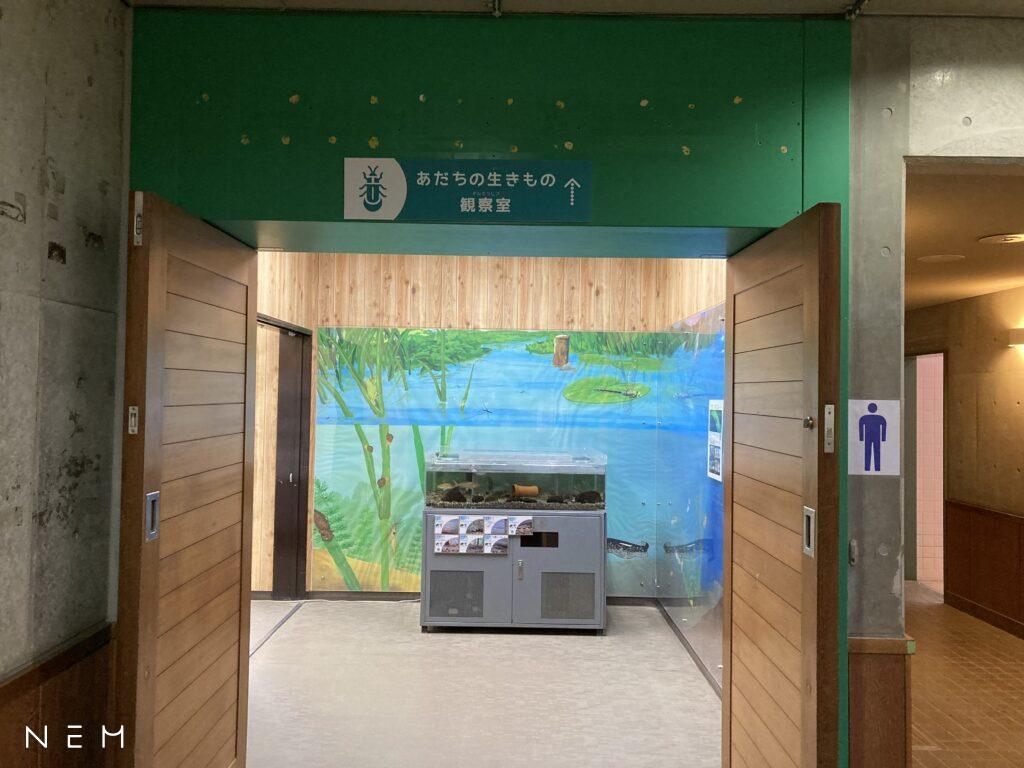 反対方面、金魚の水槽から右に進むと「あだちの生きもの観察室」が設置されており、ザリガニやアオダイショウといった身近な生きものを観察することができます。